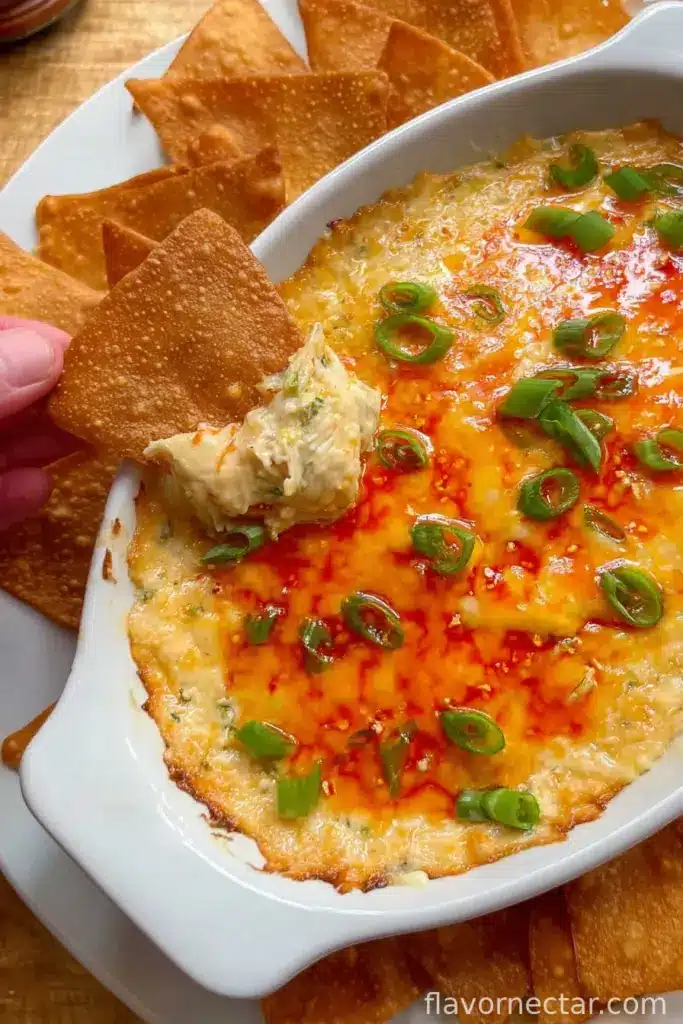 I love piling it into a little rustic bowl, still hot, surrounded by the mountain of golden wonton triangles—and sometimes, a few celery or cucumber sticks if I’m feeling guilty. My friend Jen dips potato chips in, which is chaotic energy but also, sort of works? Oh, and if you bring this to a party, there will be nothing left but rumors.
